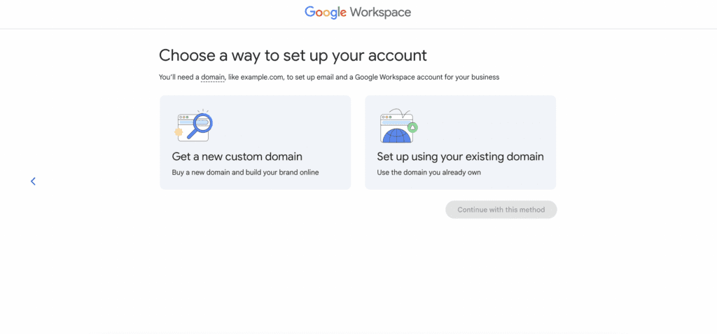 If you already have your own domain, choose the option on the right. If you haven’t, choose the option on the left, but we’re going to move forward as if you already own the domain.